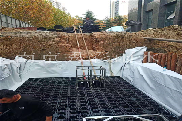 進出水管理與主體模塊采用專門裝置進行連接,包裹好防滲土工布后,在模塊池四周和頂部鋪PVC防護板。若集水井中有水就必須保證一直抽水。